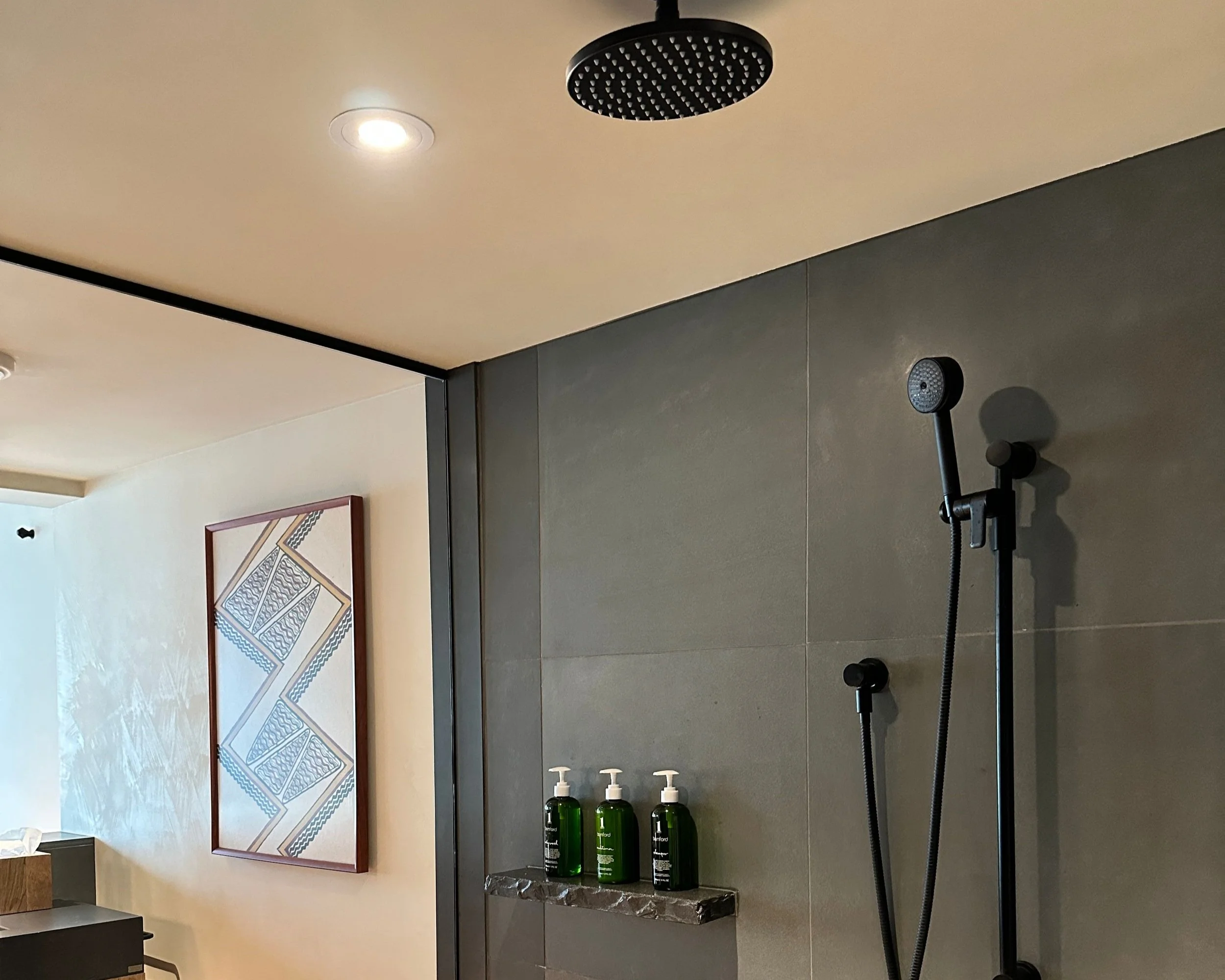 The showers are large and equipped with rain showerheads, providing a luxurious spa-like experience. The use of natural materials such as stone and wood creates a peaceful and calming environment.