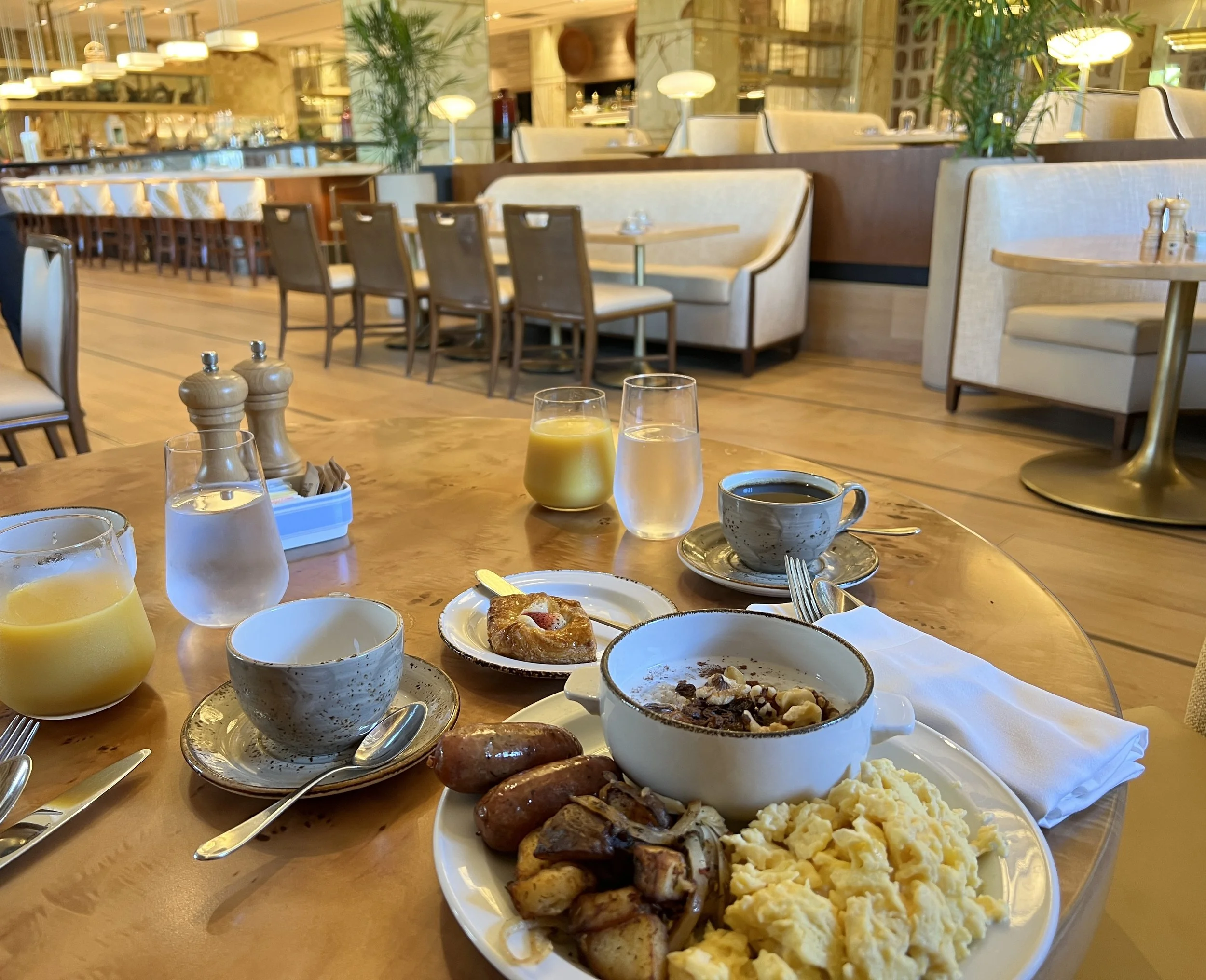 Breakfast is served via a la carte or breakfast buffet. The breakfast buffet features a hot food station with scrambled eggs, breakfast potatoes and meats, an omelet station, a pancake, waffle and oatmeal station, a charcuterie station, a juice, fruit and yogurt station, and a bakery station with breads and pastries.
