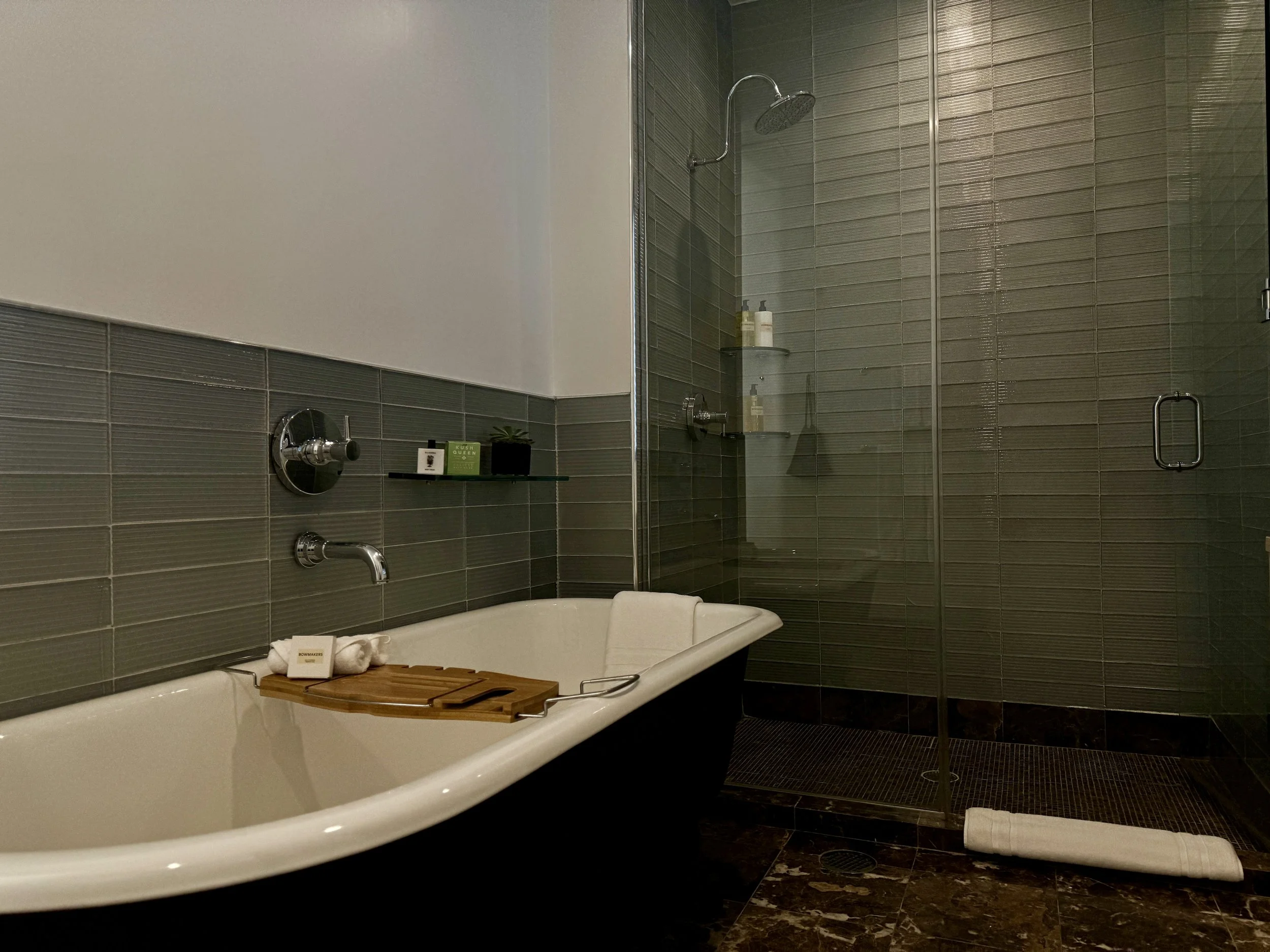 Staying in the Thompson Suite at Gild Hall is a refined and cozy experience in the heart of Lower Manhattan. This expansive suite offers a stylish retreat with a plush, king-sized bed framed by custom leather accents, and a spacious lounge area perfect for unwinding or entertaining guests. High ceilings and thoughtful design touches create an atmosphere of understated elegance, while the well-appointed bar area invites guests to craft their favorite cocktails. The luxurious bathroom, complete with a classic clawfoot tub, promises relaxation after a day exploring the city, making the Thompson Suite a true urban sanctuary.