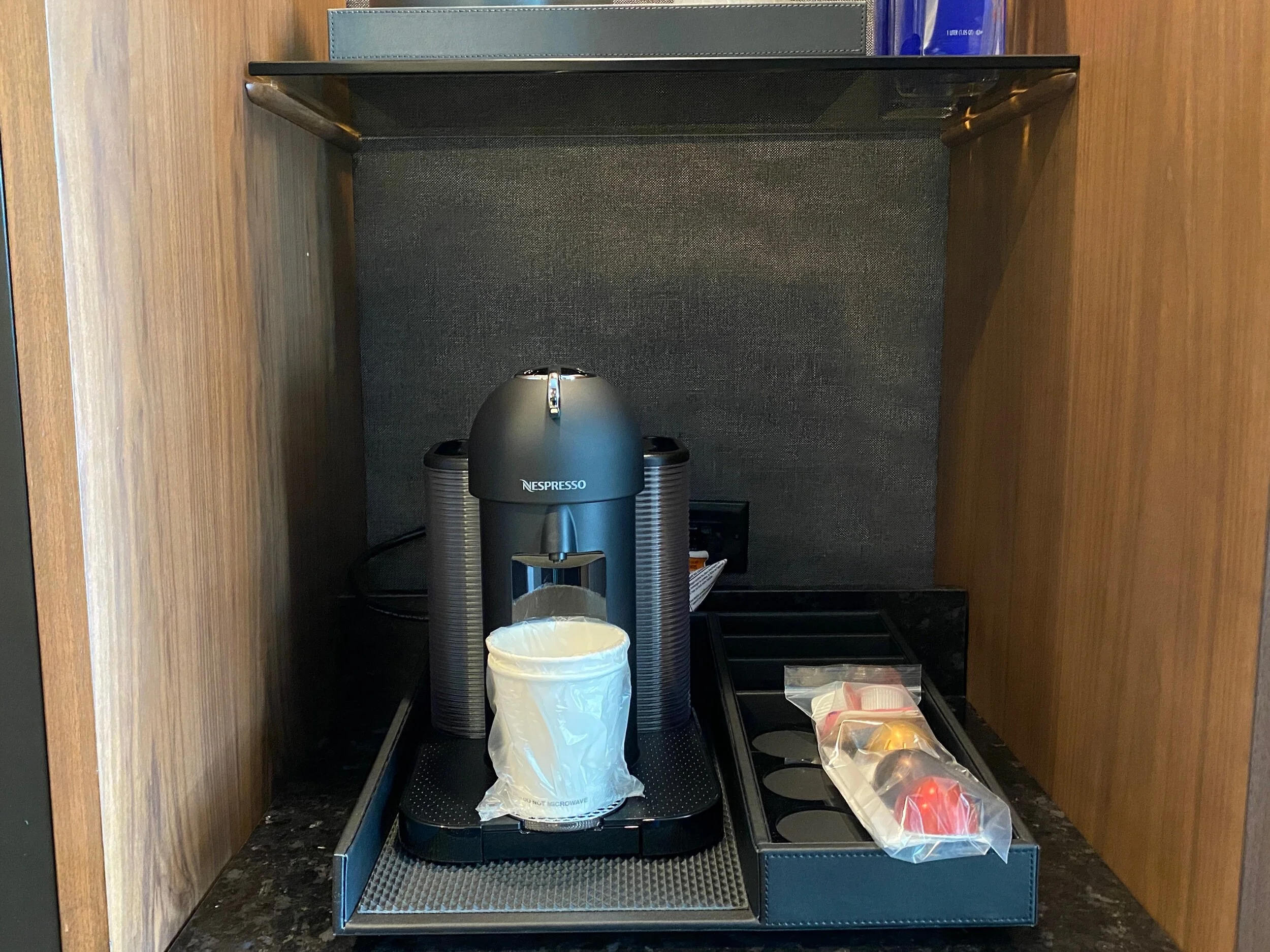 The Grand Corner King Suite is a true one bedroom suite that offers a bedroom equipped with a door and a separate living area. The living area features a Nespresso, a flat-screen TV and a mini fridge.