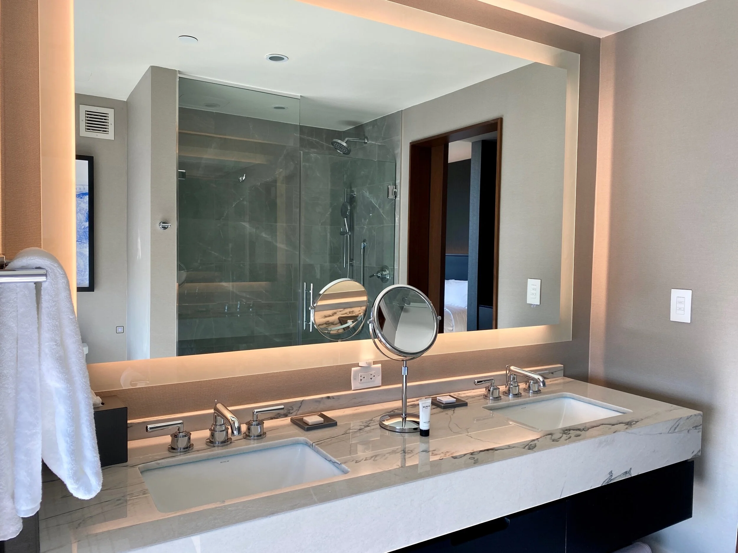 The bathroom in our suite was stunning and offered incredible views of the city. The floor to ceiling windows in the bathroom gave it plenty of natural light. And if you’re worried about privacy, the bathroom had shades that came down with the push of a button. Our only complaint was that the sun coming through the window can make the bathroom get quite warm.