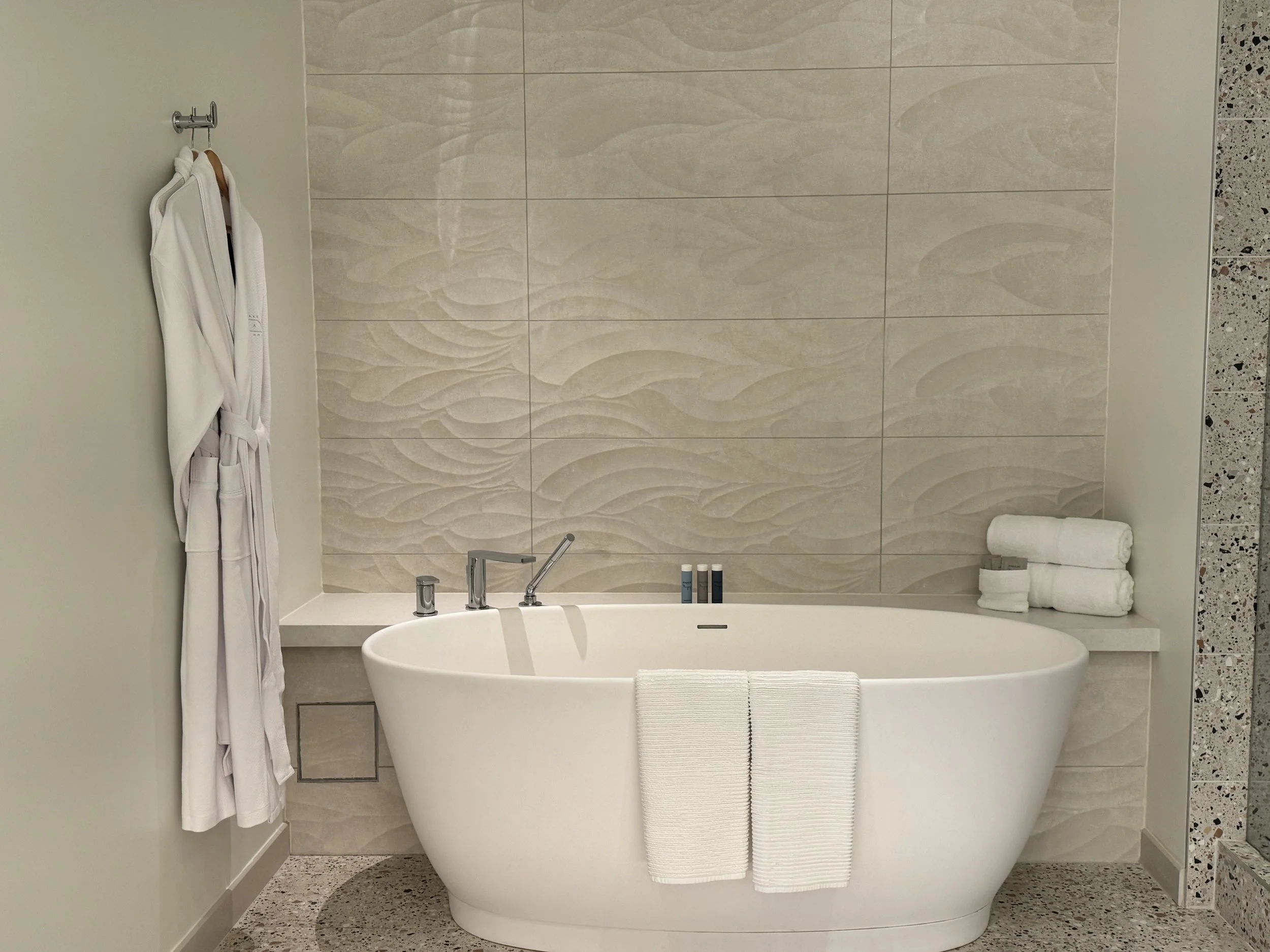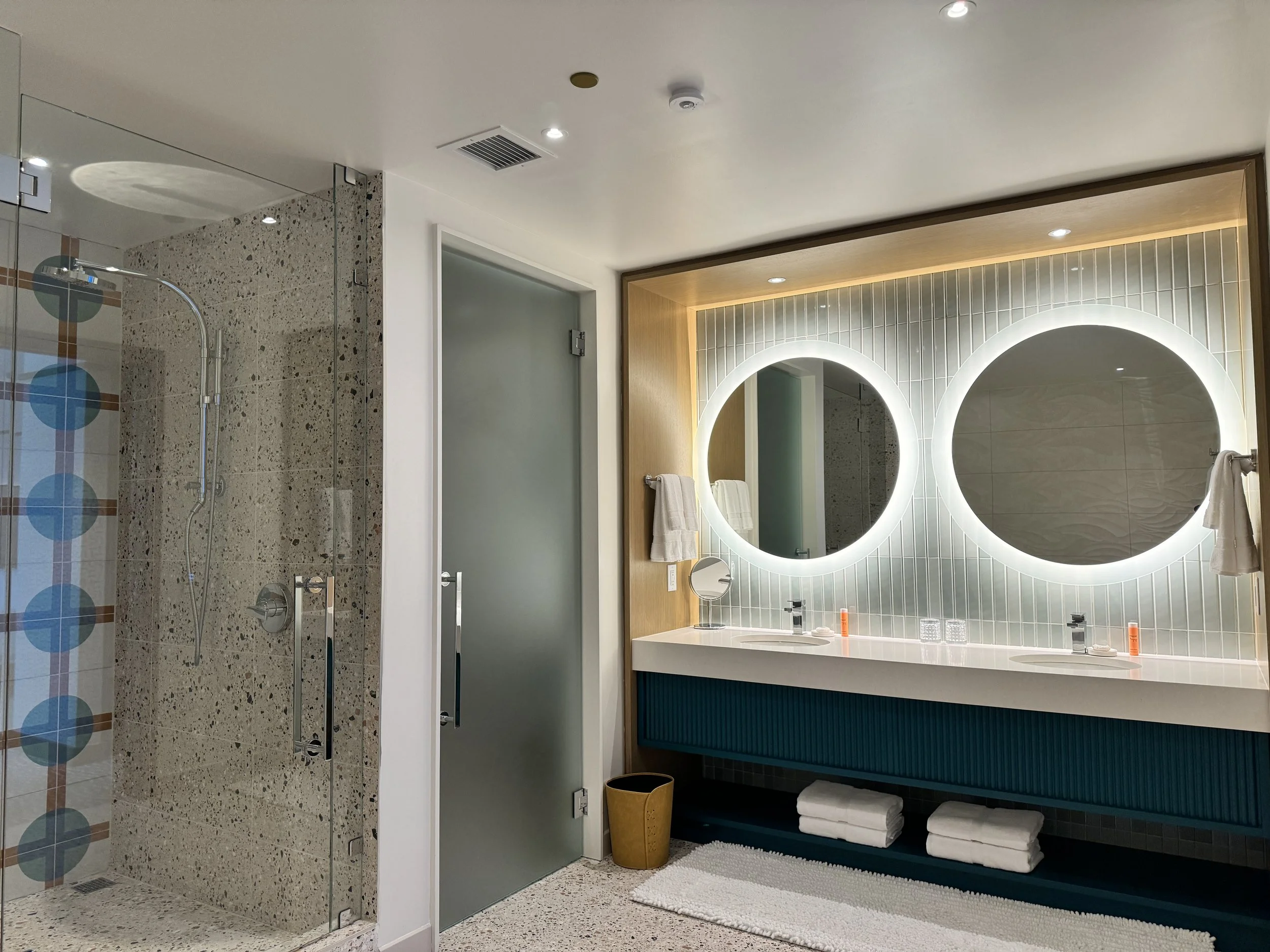 The bathrooms at the Lake Nona Wave Hotel are a true testament to luxury and modern design. Each bathroom features high-end fixtures and finishes, creating an elegant and serene atmosphere. Spacious and meticulously clean, they come equipped with large walk-in showers and, in many suites, freestanding bathtubs that offer a spa-like experience. The smart mirrors with integrated lighting add a touch of futuristic convenience, while premium toiletries and plush towels provide the ultimate comfort. Overall, the bathrooms at the Lake Nona Wave Hotel offer a perfect blend of style, functionality, and indulgence, making every stay a pampering experience.