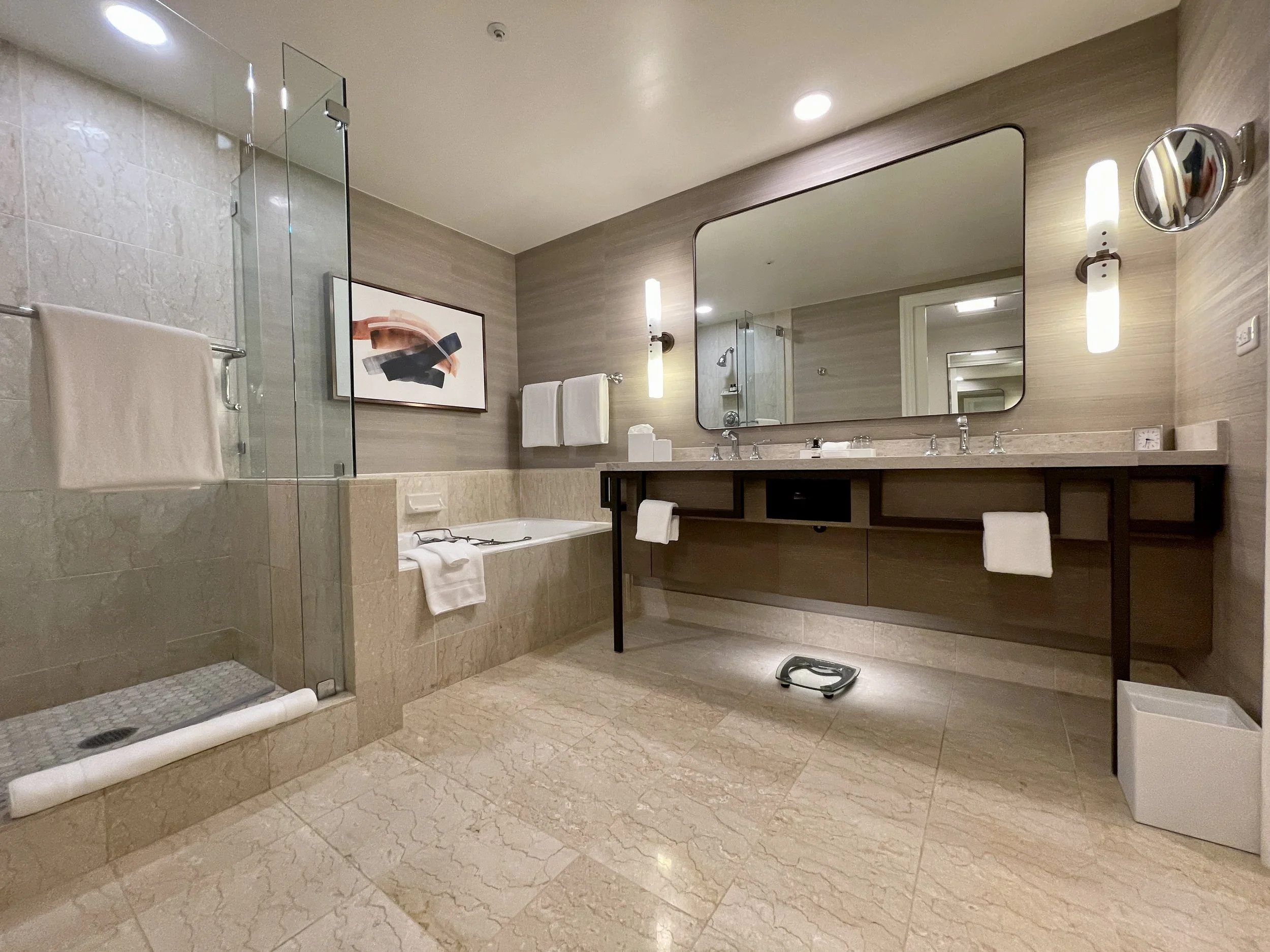 The rooms are very California luxury meets costal-chic. The rooms were very functional and feature all the modern amenities like a night light that turns on automatically when you get out of bed, charge ports including USB’s by the bed and chrome cast on the TV.