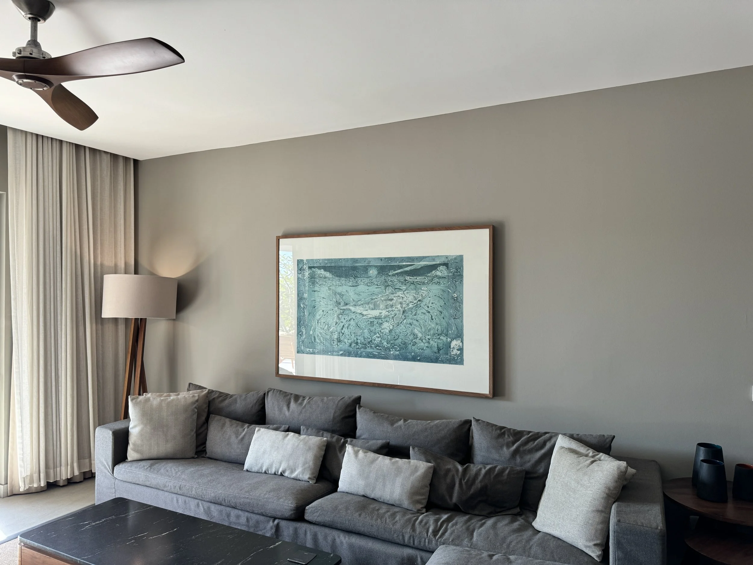 The living room of the Garden View One Bedroom Residence at The Cape is a sophisticated and inviting space designed for relaxation and socializing. It features modern, comfortable seating with plush sofas and chic accent chairs, all set against a backdrop of sleek, minimalist decor that blends natural materials with contemporary design elements. Large floor-to-ceiling windows flood the room with natural light and offer calming views of the surrounding gardens, enhancing the connection between indoor and outdoor spaces.