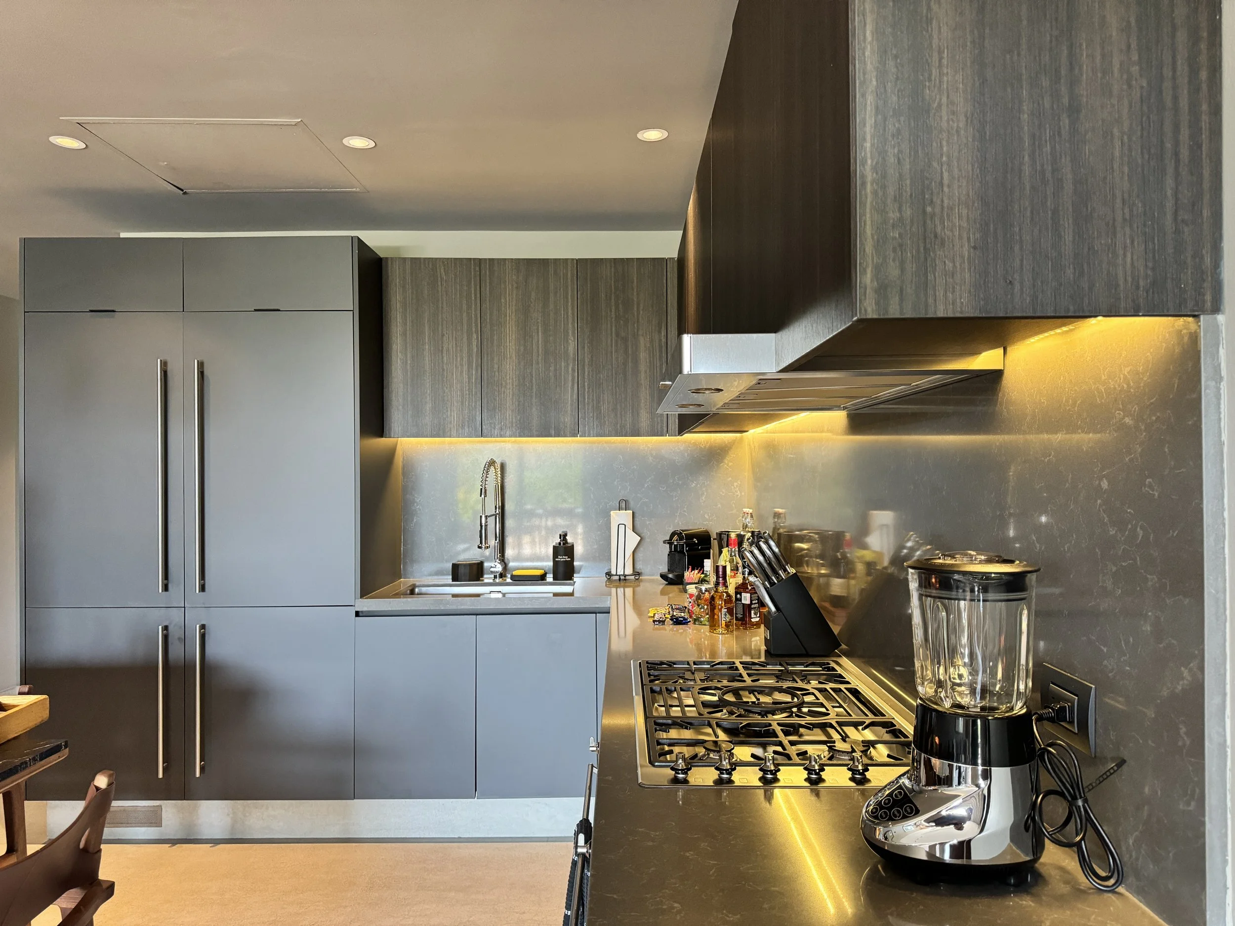 The adjacent kitchen is equally stylish and functional, equipped with high-end appliances and ample counter space, perfect for preparing meals or enjoying a casual breakfast. The kitchen’s design seamlessly integrates with the living area, featuring elegant cabinetry and a neutral color palette that complements the overall aesthetic of the residence. Together, the living room and kitchen create a harmonious space that is both luxurious and comfortable, ideal for unwinding or entertaining during your stay.