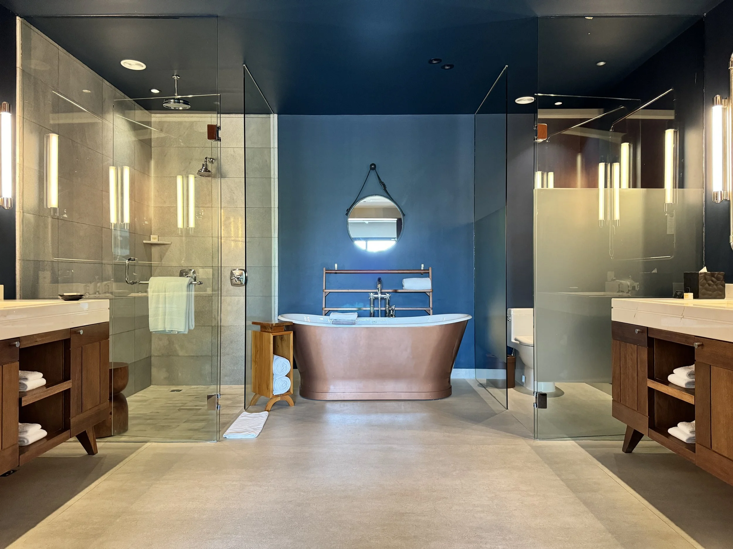 The bathroom featuring a freestanding copper tub is a stunning blend of luxury and craftsmanship. The tub itself serves as a striking centerpiece, radiating warmth and elegance, perfect for a relaxing soak. The space is complemented by dual vanities, offering ample space and sleek, modern design for two. Dual closets provide generous storage, ensuring a clutter-free environment. The large walk-in shower, with its clean lines and premium fixtures, adds to the spa-like ambiance. Together, these elements create a bathroom that is both functional and indulgent, offering a serene retreat within the home.