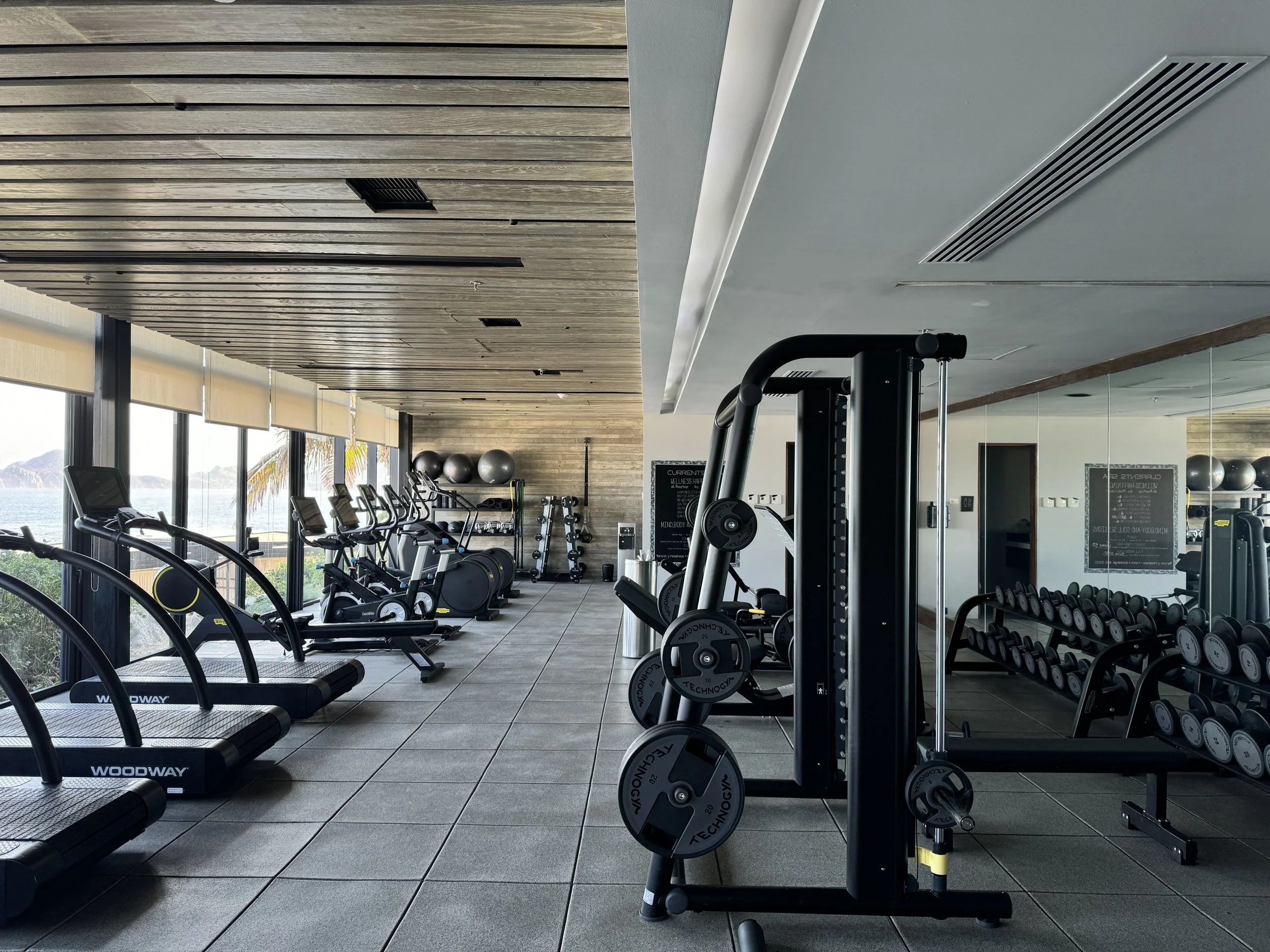 The fitness center at The Cape, a Thompson Hotel, is a state-of-the-art facility designed to enhance guests' wellness experience. Featuring cutting-edge equipment and ample space, it offers a range of cardio machines, free weights, and functional training areas. With its sleek, modern design and expansive windows providing natural light and stunning ocean views, the fitness center creates an inviting atmosphere for both invigorating workouts and serene moments of exercise. Whether guests are looking to maintain their routine or explore new fitness routines, the center provides all the amenities needed for a fulfilling workout experience.