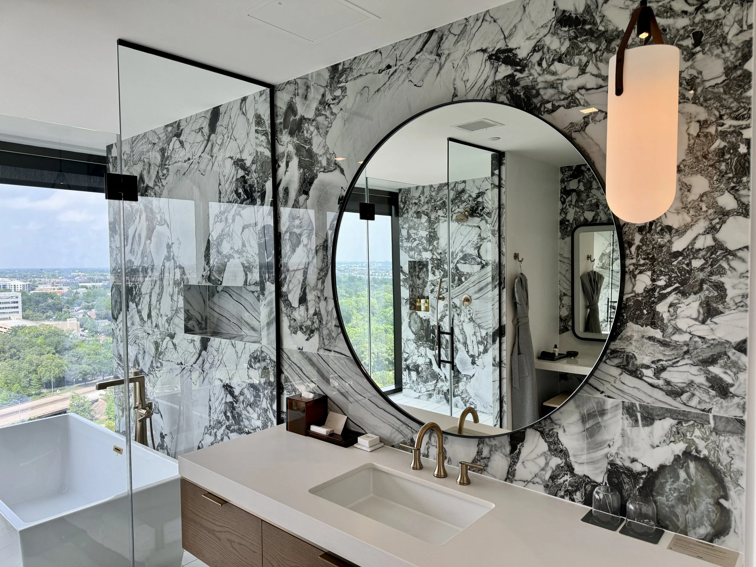 Guests awaken to breathtaking vistas of either the downtown Houston skyline or the lush greenery of Buffalo Bayou Park from the floor-to-ceiling windows of one of the 172 contemporary hotel rooms, which include 34 luxurious suites with a residential ambiance. These elegantly appointed spaces boast designer furnishings, adorned with mid-century modern fabrics and textures, complemented by the warmth of hardwood floors.
