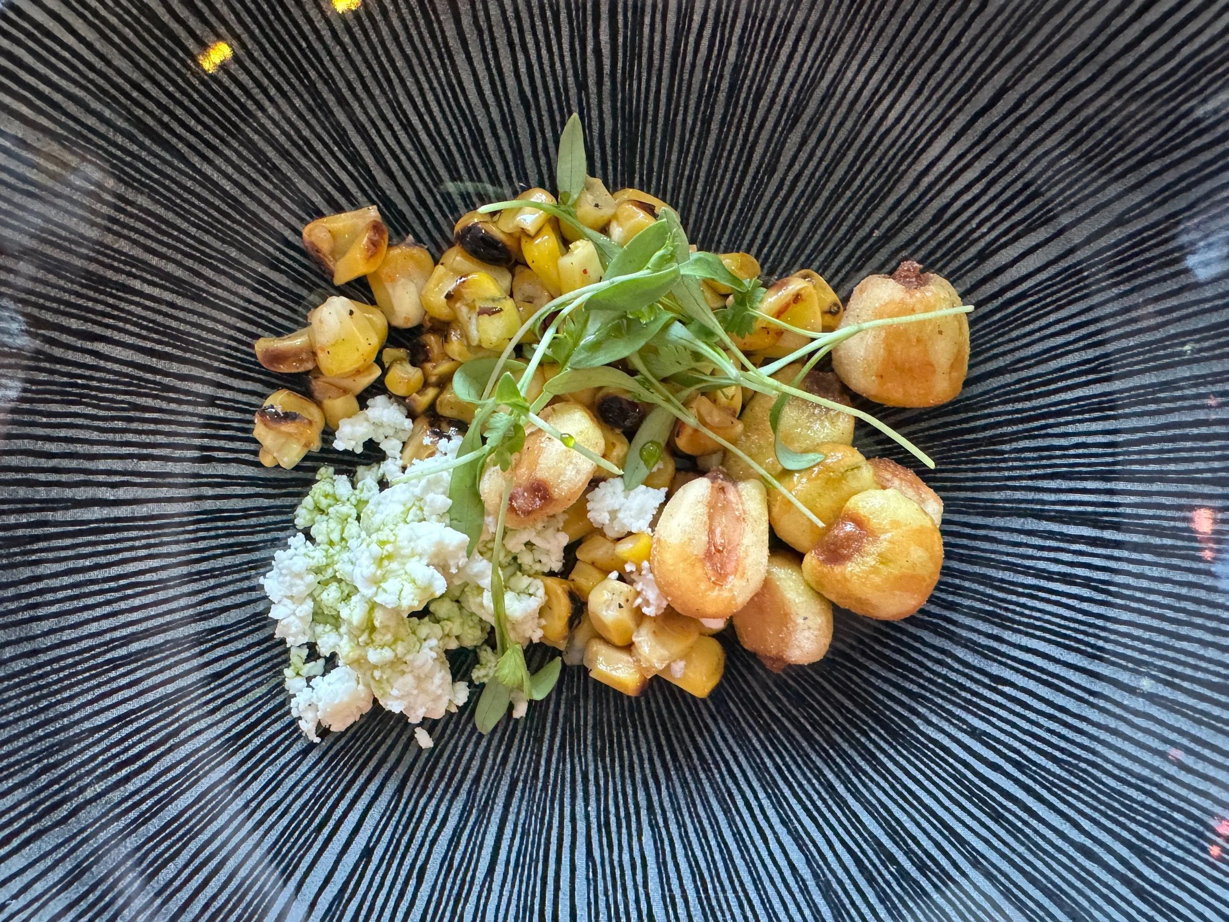 Next, savor the Soup course - Corn in a Cup, a symphony of flavors featuring sweet corn, lime kewpie, Tajin dust, crunchy corn nuts, and crumbled Cojita cheese, perfectly balanced to evoke the essence of summer. Here is a picture before the liquid was added bringing the soup to life.